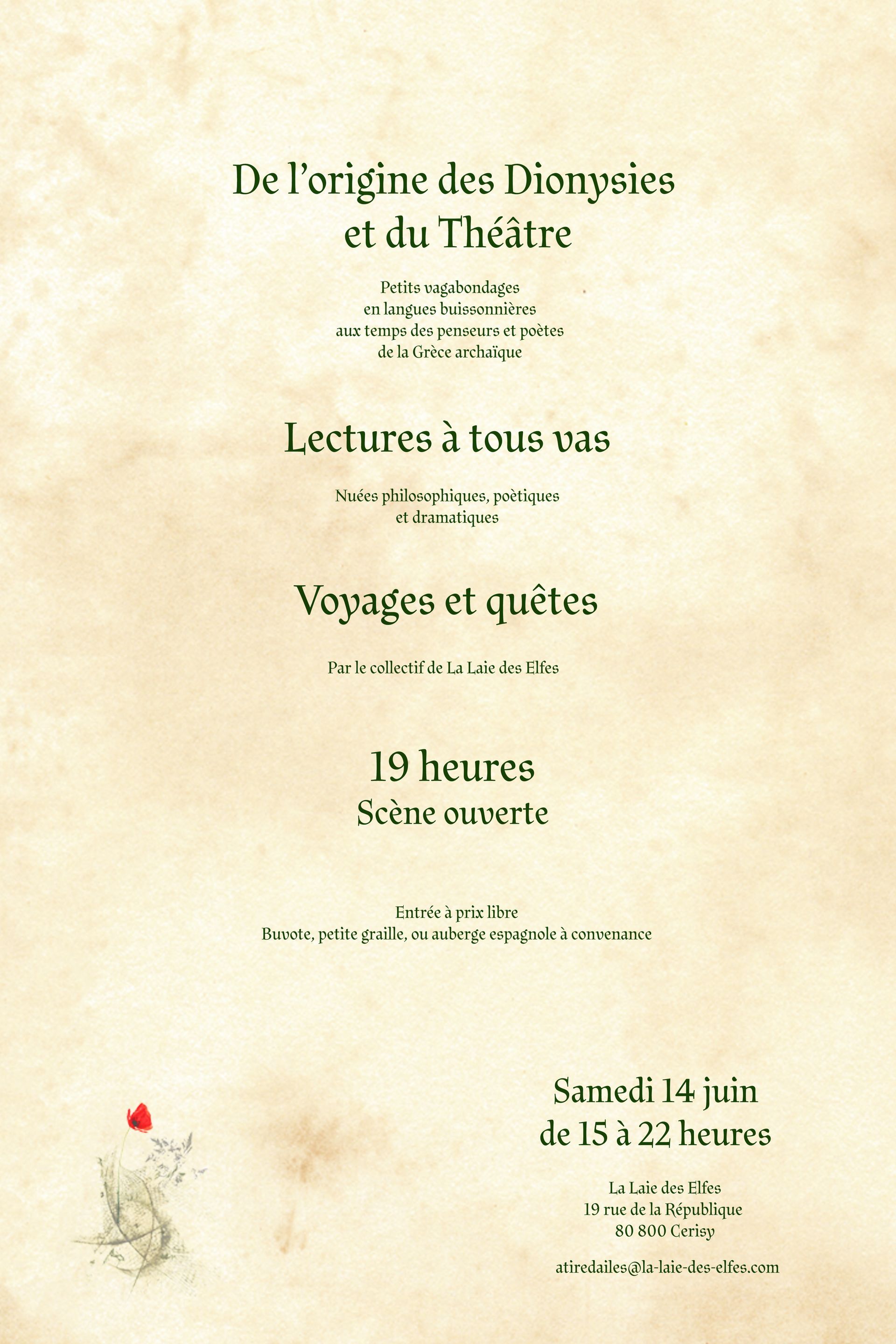Le théâtre est ce lieu même où le pouls de la terre en remémore aux hommes les divines étendues de l'Être ... Evohé ! ... les chants de l'Enthousiasme qui consentent à éclore en l'humaine essence l'infaillible puissance lumineuse d'où surgit l'inspiration des poètes ... La création, nouaisons spontanées des sens, de l'Éther et du Logos ... Les dieux en veines germent, et, gorgés des fors de l'humus, les hommes, du cocon de leurs mythes, éveillent en eux l'efflorescence.