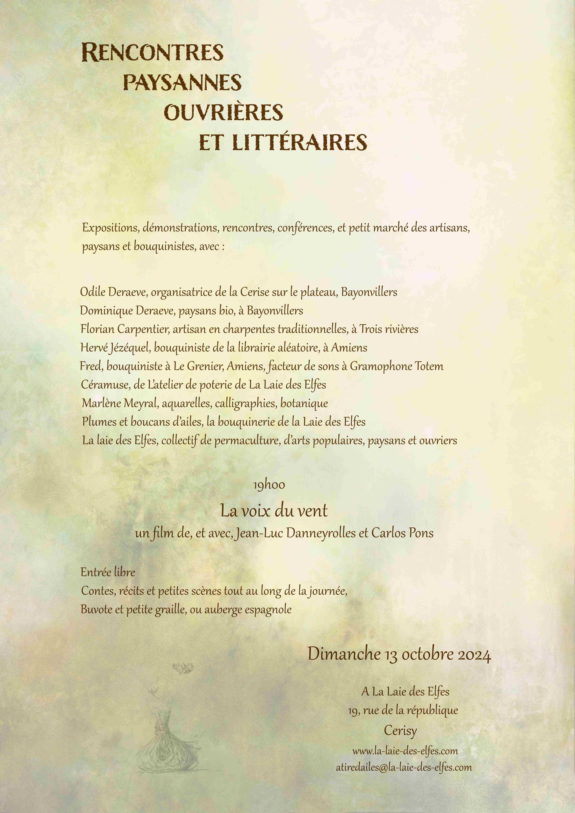 Diffusion de LA VOIX DU VENT, film de, et avec, Jean-Luc Danneyrolles et Carlos Pons ... un petit périple depuis le potager d'un curieux de Jean-Luc, à Saignon, en Provence, aux initiatives populaires d'Andalousie, et passant par bien d'autres encore ...