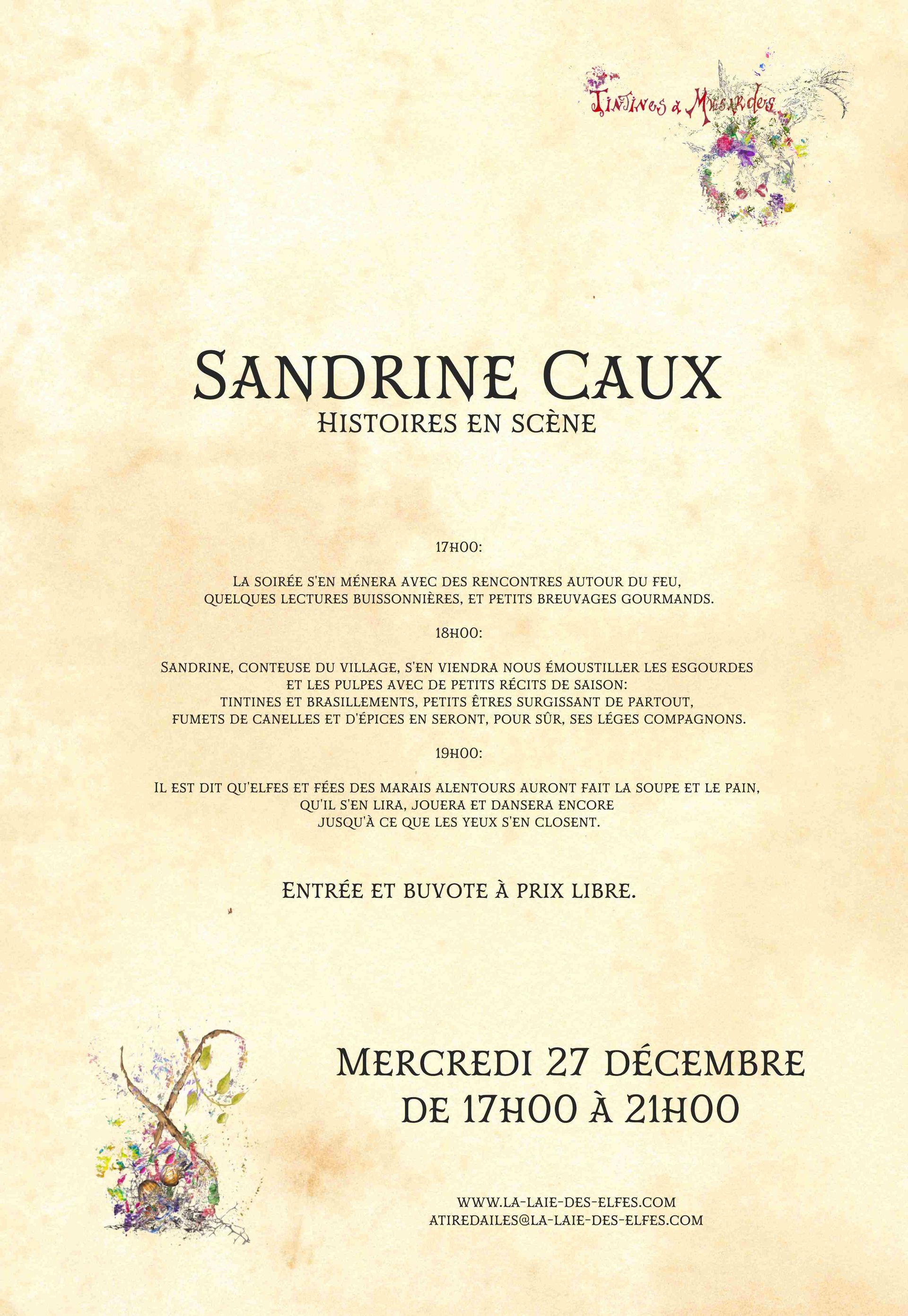 Sandrine, conteuse du village, s'en viendra nous émoustiller les esgourdes et les pulpes avec de petits récits de saison: tintines et brasillements, petits êtres surgissant de partout, fumets de canelles et d'épices en seront, pour sûr, ses léges compagnons.